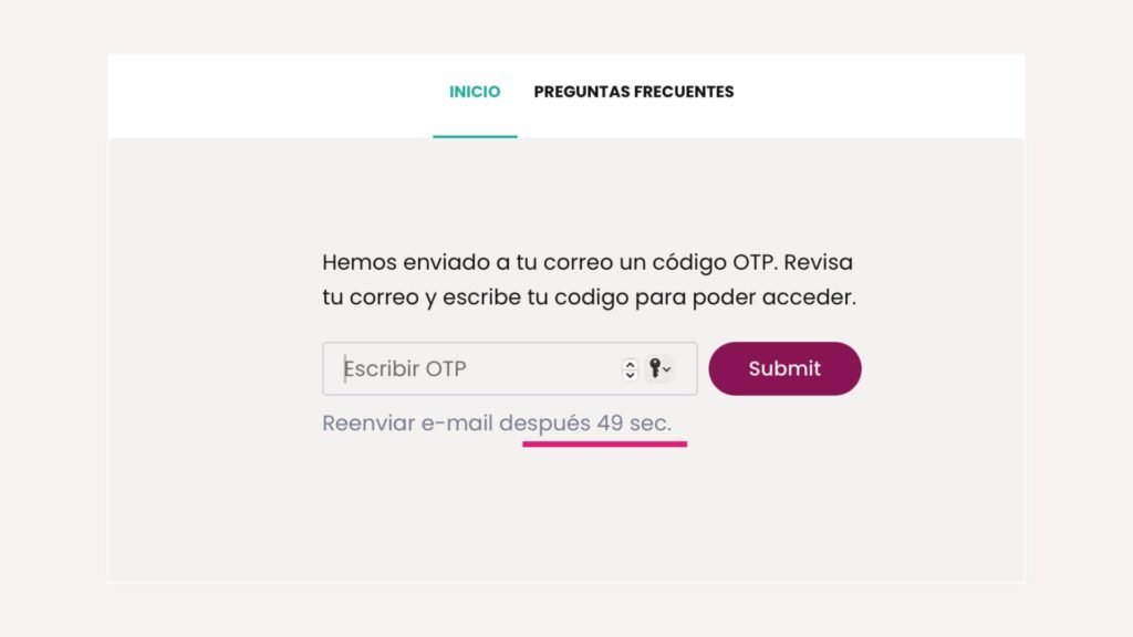 El código OPT es necesario para la seguridad de tus datos, ya que gracias a este código sólo tu puedes verlo, este código llegará a tu correo de registro, tendrás de 50 a 60 segundos para ingresarlo. Si en este periodo de tiempo (50 a 60 segundos) tu no recibiste un correo con tu código OTP te sugerimos leer este artículo.