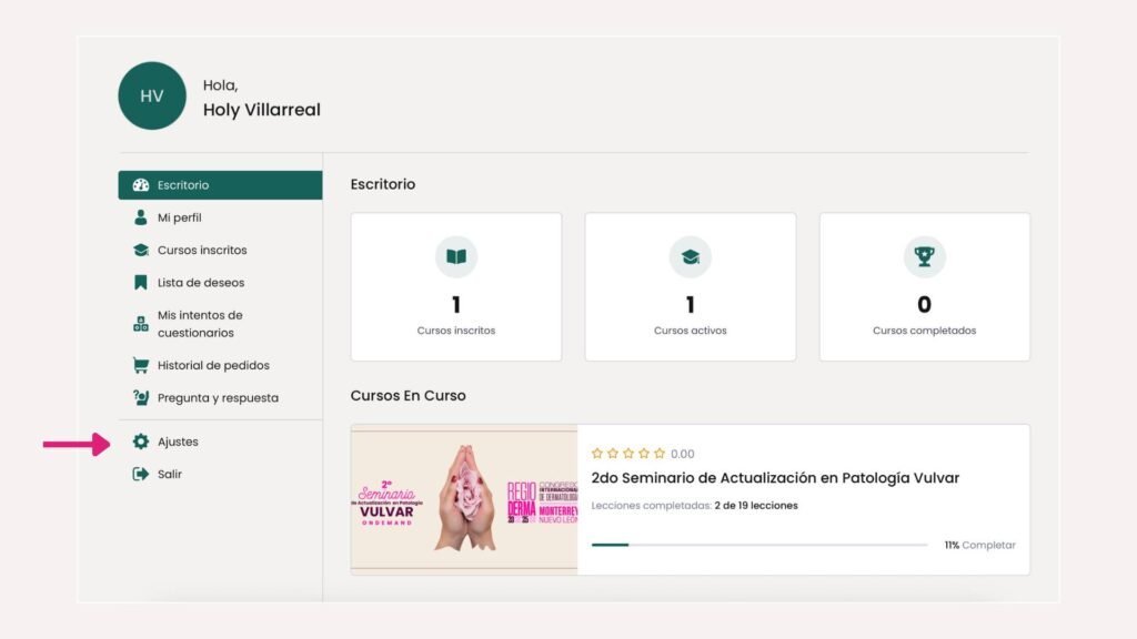 Una vez has ingresdao tu código e ingresaste a tu dashboard, deberás encontrar de lado izquerdo inferior la opción de ajustes.