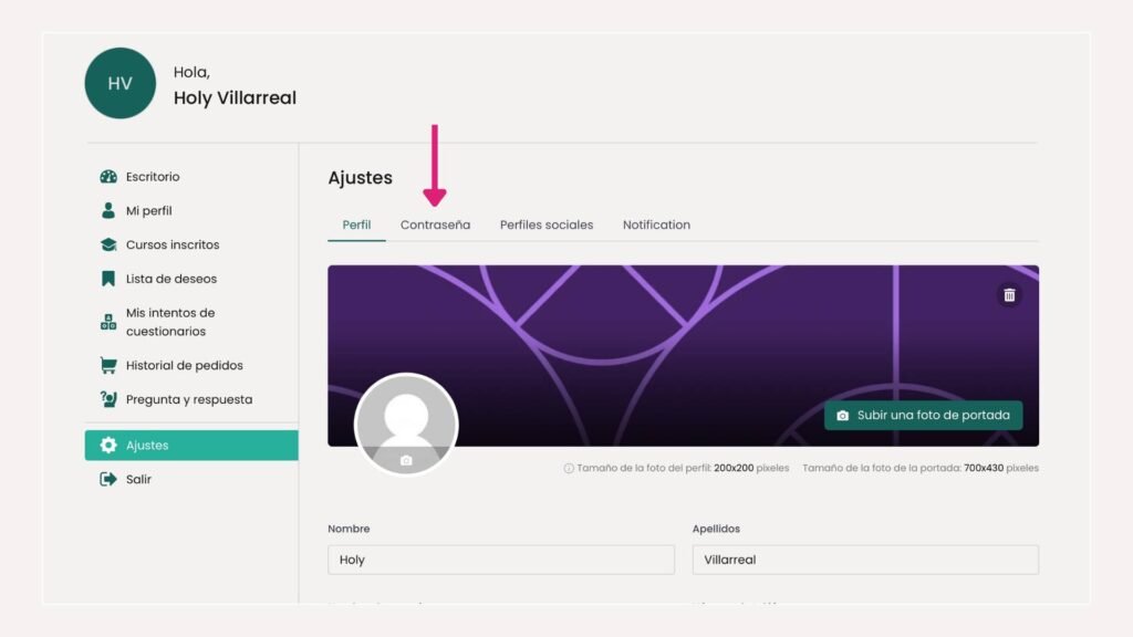 En esta sección podrás editar tu perfil, pero también podrás encontrar la sección para cambiar tu contraseña provisional.