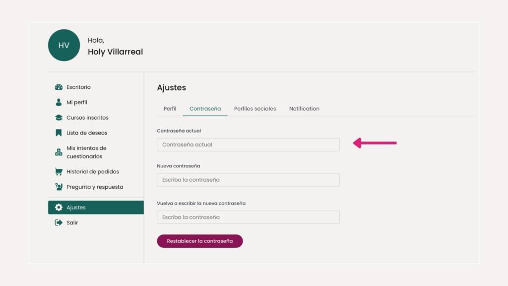 Da click en la sección contraseña y podrás encontrar la siguiente pantalla, donde deberás poner la contraseña actual (que en la mayoría de los casos es la contraseña provisional que ha llegado a tu correo), eventualmente deberás ingresar la contraseña nueva en dos ocasiones para que se confirme y después dar click en el botón «restablecer contraseña».